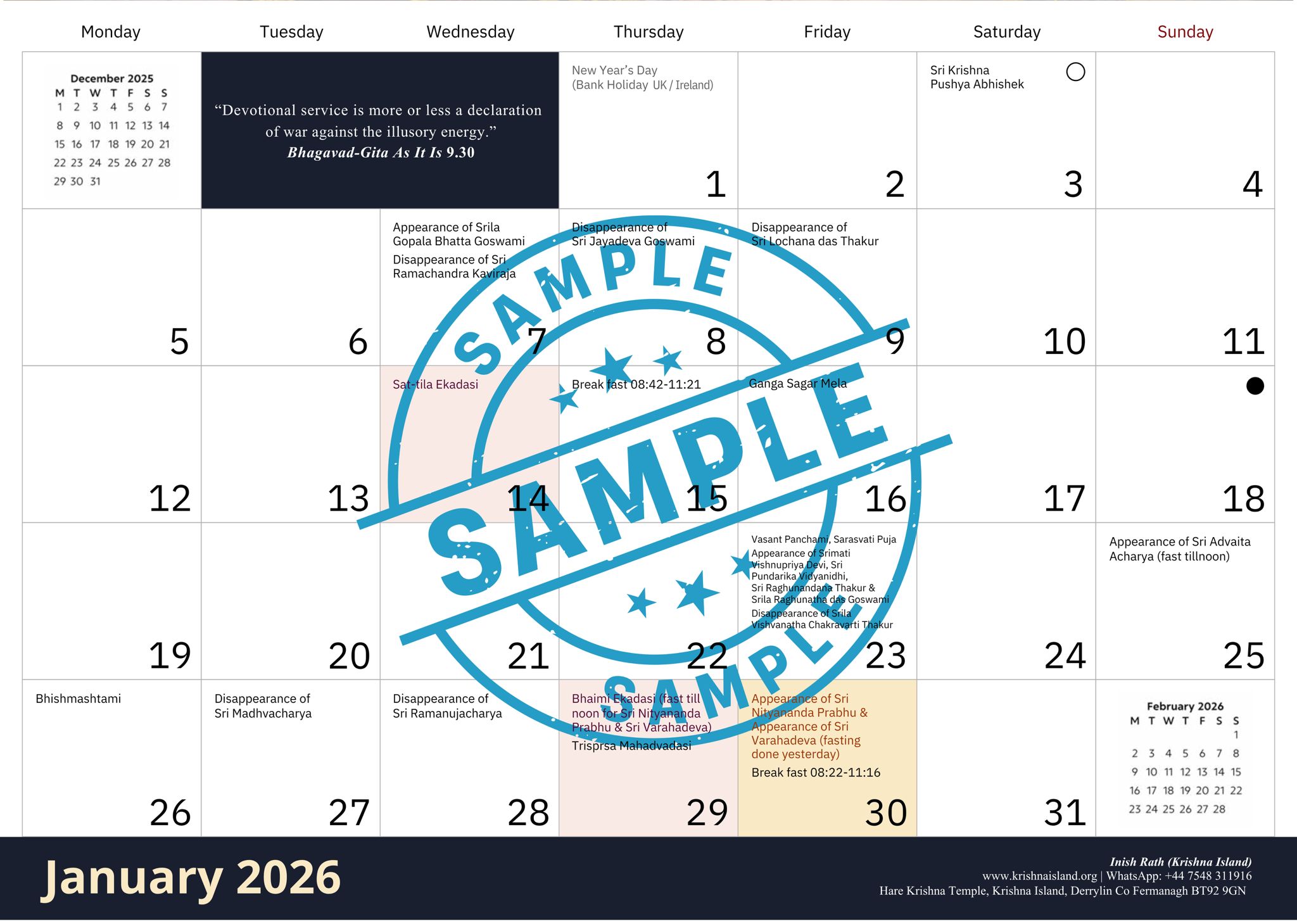 Begin 2026 in a mood of devotion with our beautifully designed Vaishnava Calendar, featuring breathtaking photos from ISKCON Ireland — Belfast, Dublin, Inish Rath, Rathayatra celebrations, Giriraj Govardhan, and Lord Narasimhadev from Mayapur.